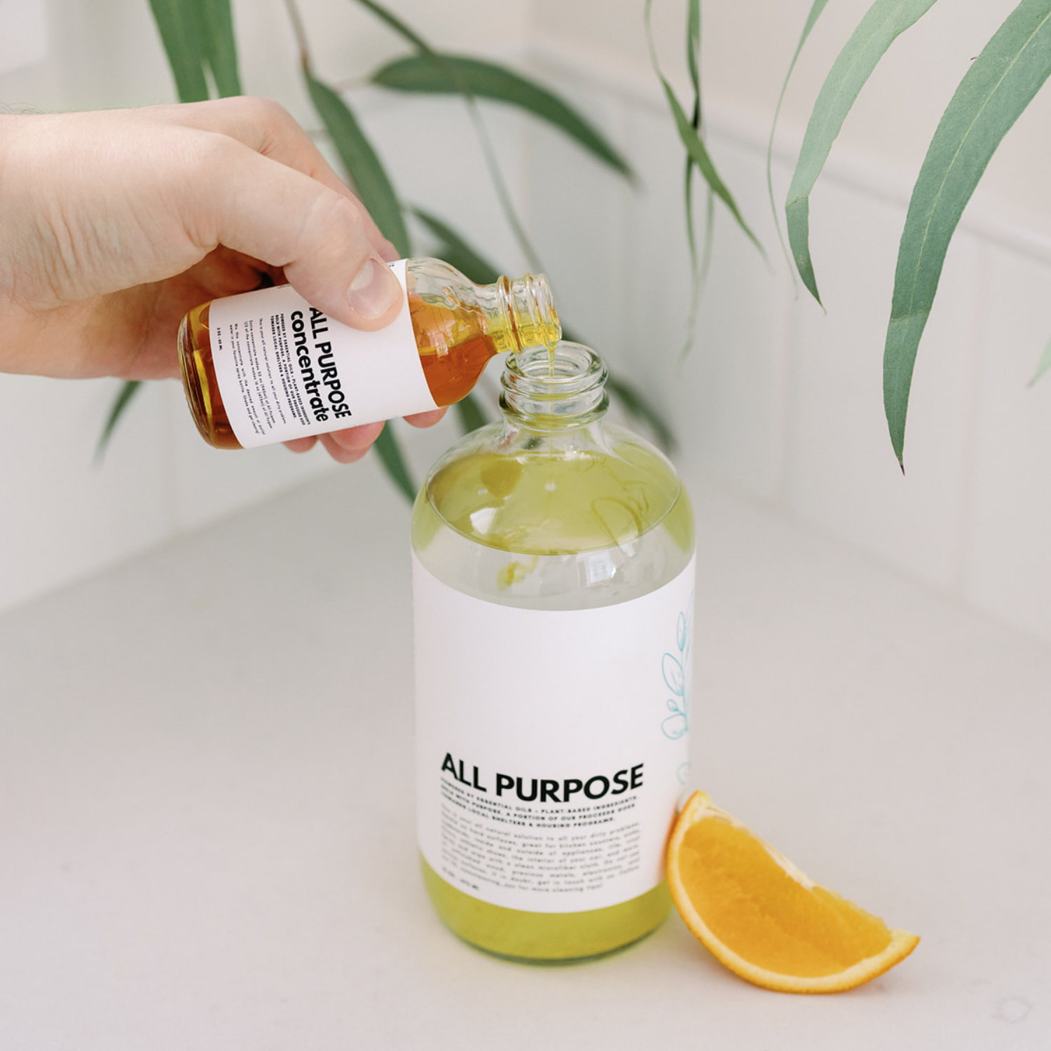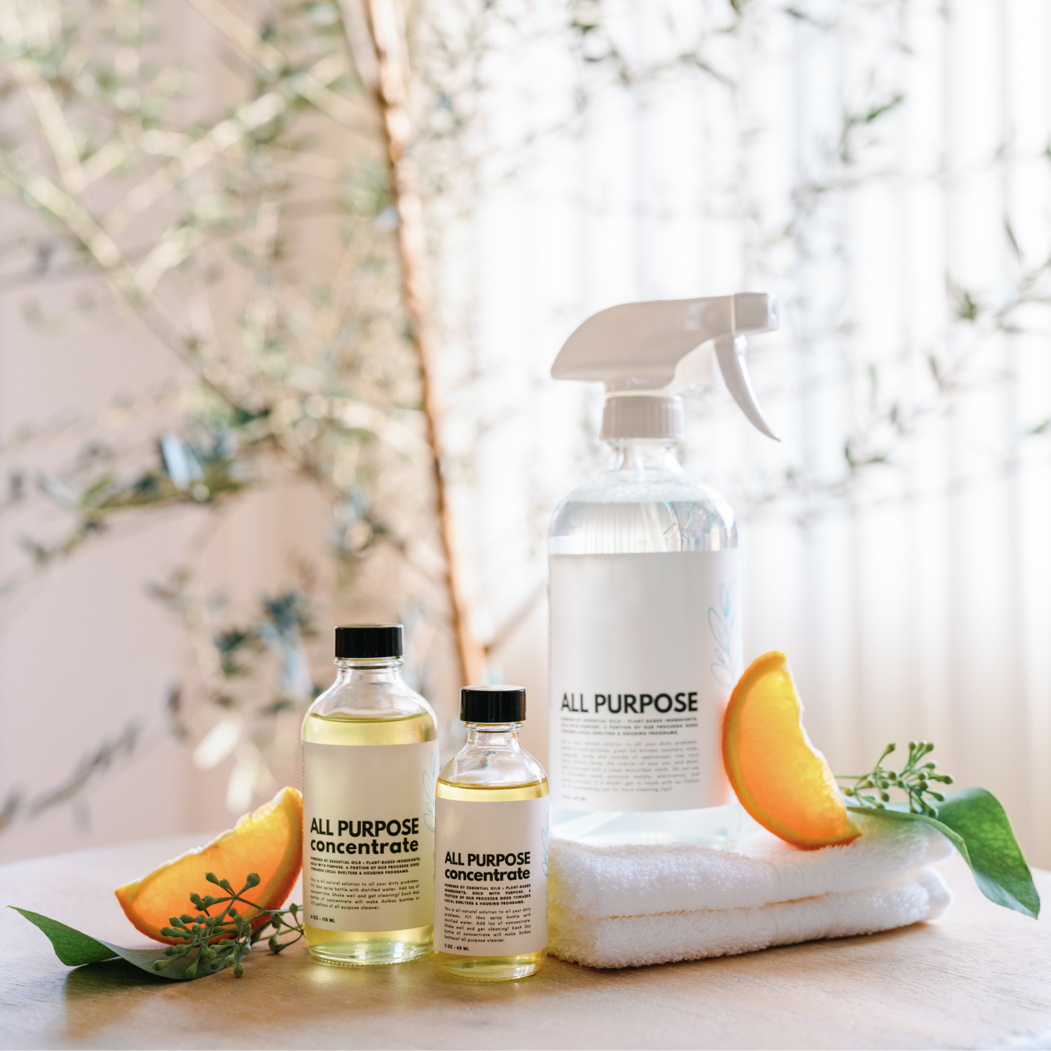 SIZE/DESCRIPTION: Refill, not landfill. 2 oz or 4 oz. allows you to make ALL PURPOSE at home. Fill 16oz spray bottle with distilled/purified water. Add 1oz of concentrate (2tbsp). Shake well and get cleaning! Glass spray bottle is not included.